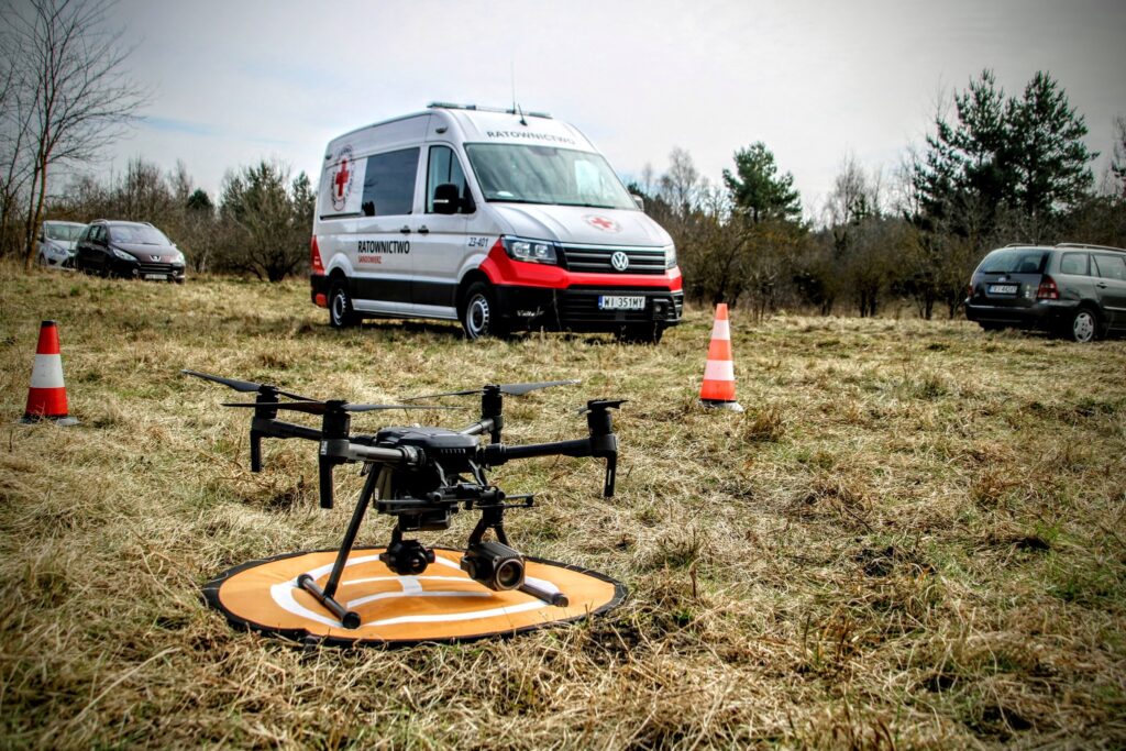- Sprzęt – platformy wielorotorowe z optyką dzienną/termiczną, oświetlenie, głośniki, zestawy RTK.